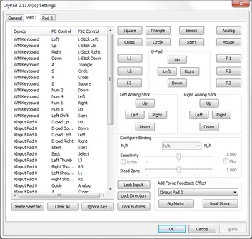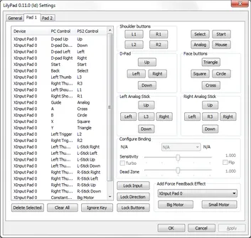 In previous versions of the LilyPad plugin it was impossible to complete certain dance moves in games like the Dance Dance Revolution/Dancing Stage series where you were required to press both the up and down or left and right buttons simultaneously. This has now been resolved making all the game requiring such input fully playable. Additionally the layout of the controller buttons on the pad settings page has been improved to more closely resemble a modern analog controller/DualShock configuration.